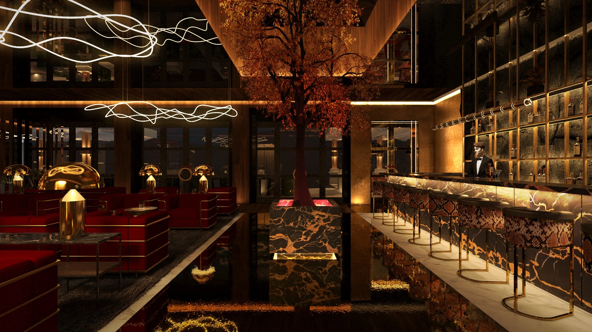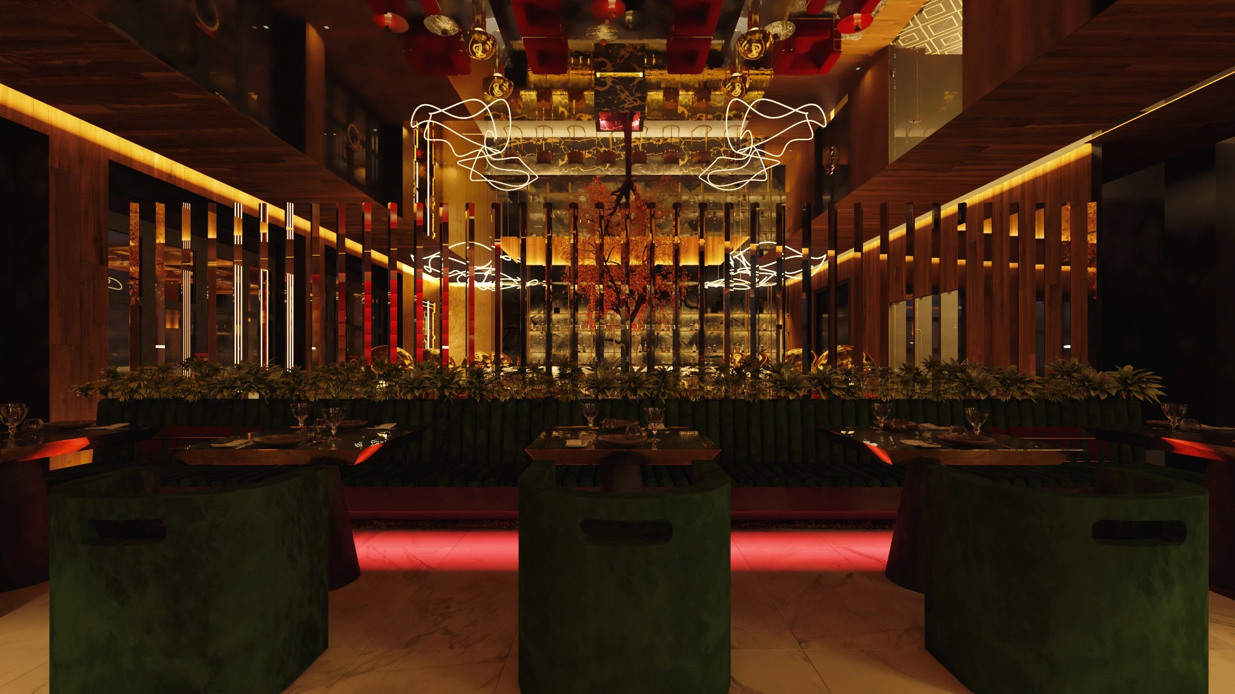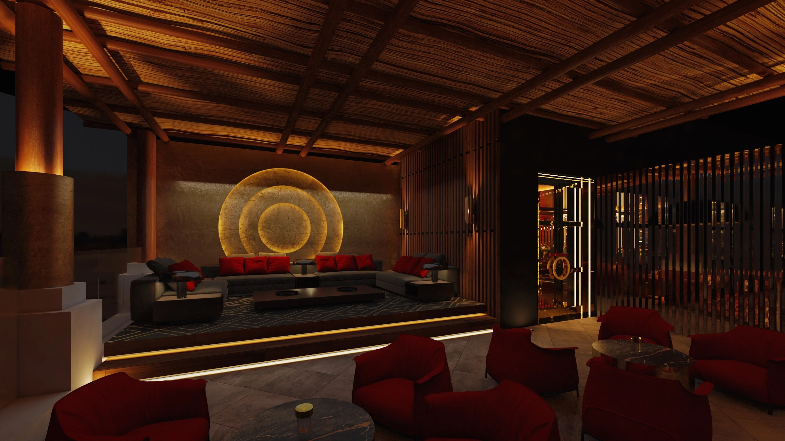 Un espacio que fusiona el lujo contemporáneo con una narrativa sensorial inspirada en el entorno árido y majestuoso del desierto. La propuesta toma forma en un lounge sofisticado donde la iluminación escultórica, los materiales nobles y una paleta cálida crean una atmósfera envolvente. En el centro, un árbol rojo se erige como símbolo de vida y contraste, integrando el paisaje exterior con una experiencia interior teatral y envolvente. Cada elemento ha sido cuidadosamente diseñado para generar un ambiente exclusivo, que celebra la identidad de KO mientras ofrece una experiencia inmersiva e inolvidable.