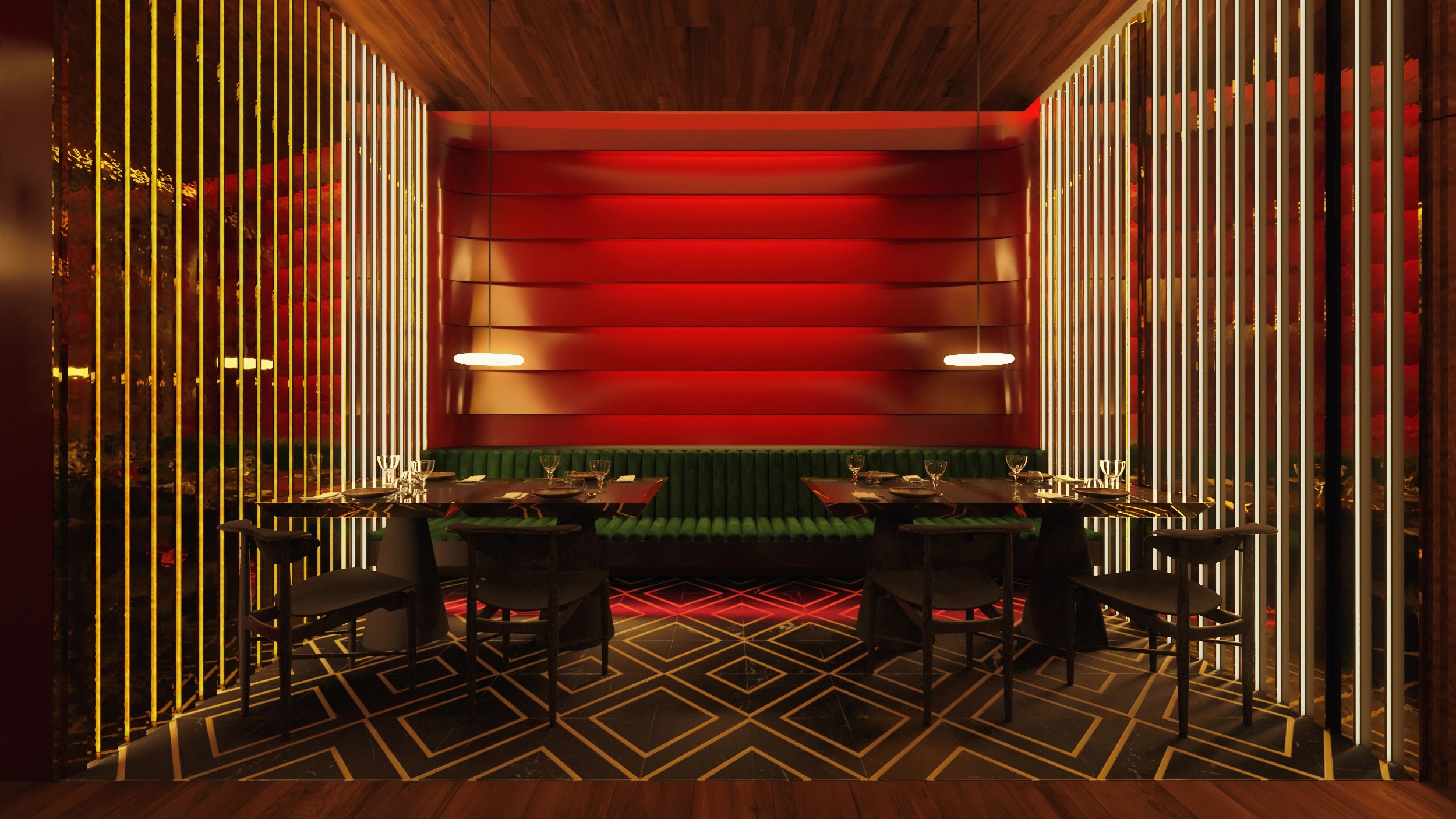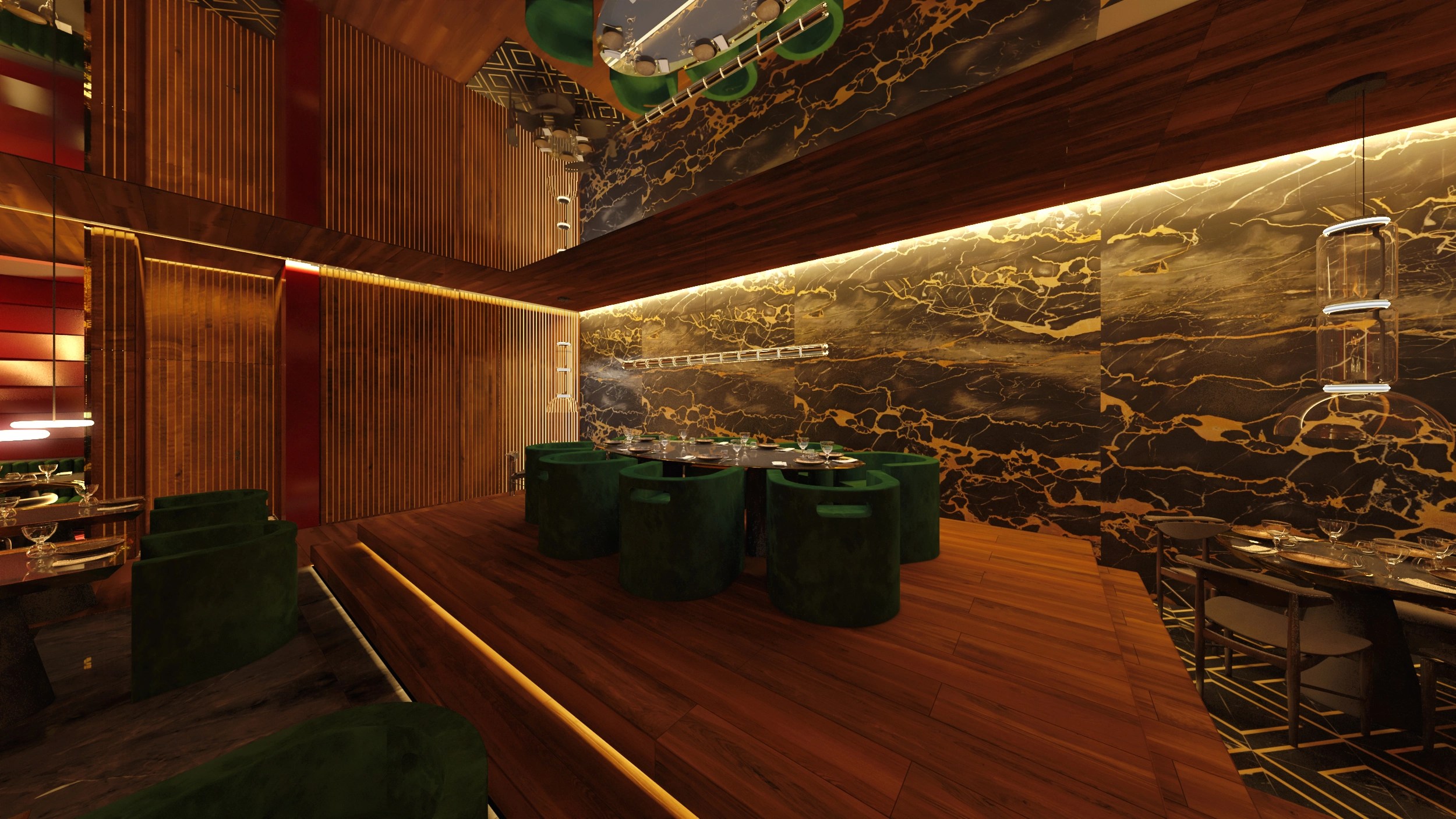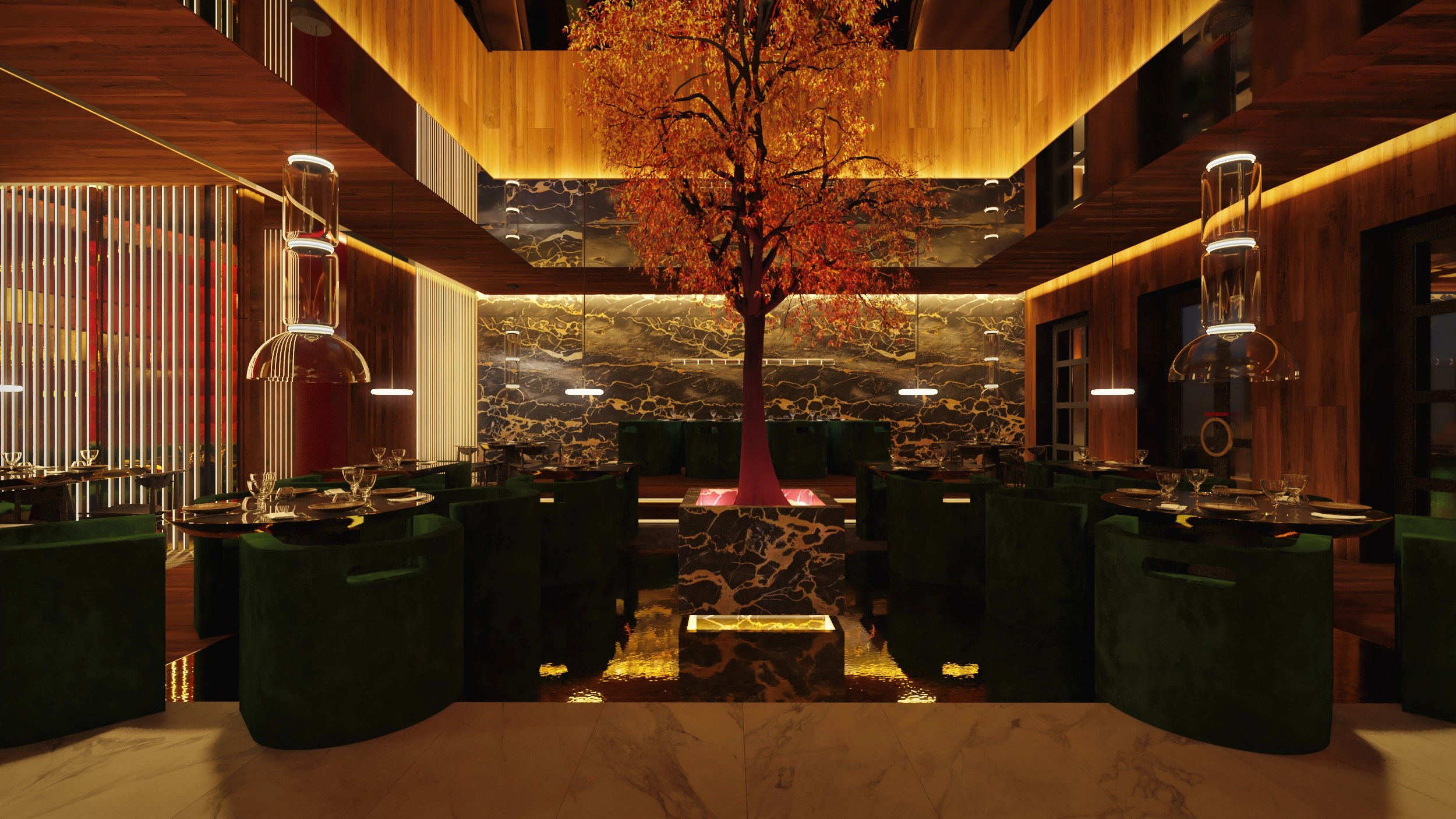 Un espacio que fusiona el lujo contemporáneo con una narrativa sensorial inspirada en el entorno árido y majestuoso del desierto. La propuesta toma forma en un lounge sofisticado donde la iluminación escultórica, los materiales nobles y una paleta cálida crean una atmósfera envolvente. En el centro, un árbol rojo se erige como símbolo de vida y contraste, integrando el paisaje exterior con una experiencia interior teatral y envolvente. Cada elemento ha sido cuidadosamente diseñado para generar un ambiente exclusivo, que celebra la identidad de KO mientras ofrece una experiencia inmersiva e inolvidable.